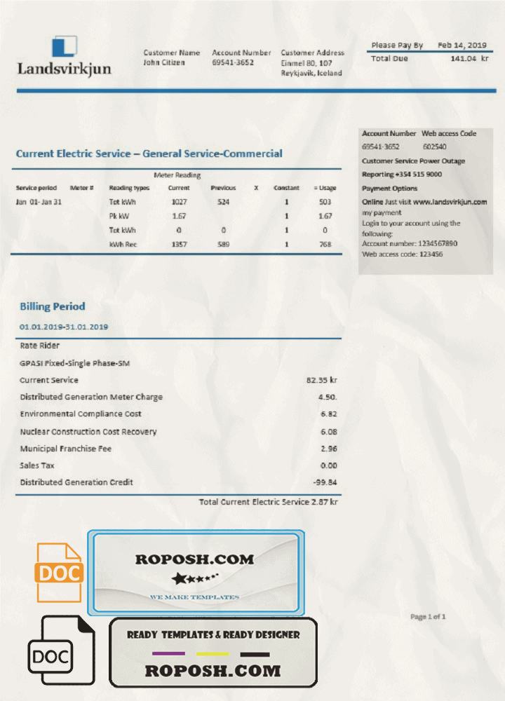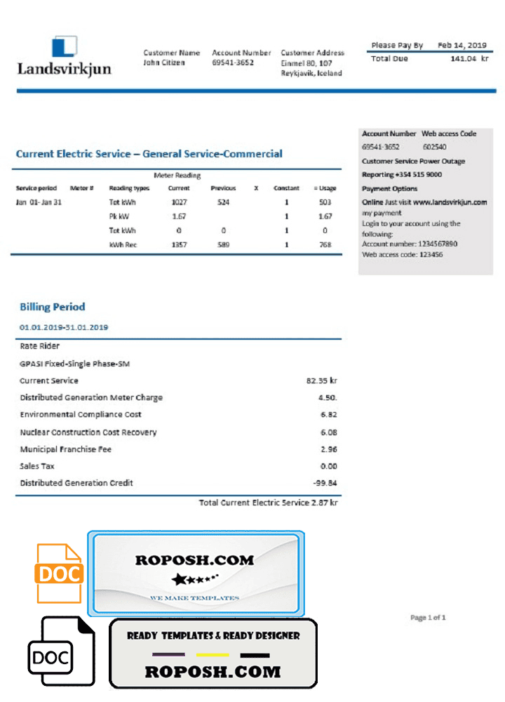 Iceland National Power Company of Iceland Landsvirkjun electricity utility bill template in Word and PDF