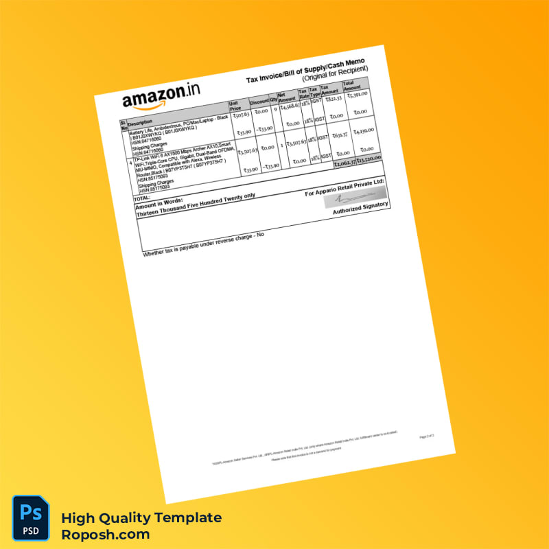 Streamline your billing process with the India Amazon Invoice Template, designed for easy customization and professional presentation. Available in both Word and PDF formats, this editable invoice template is tailor-made to meet the needs of businesses and freelancers who require a reliable, blank editable invoice template for seamless invoicing.