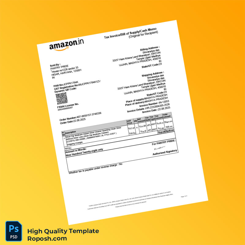 India Amazon Seller Services Private Limited Invoice Template in Word and PDF formats India Pantry Pride Tax Invoice Template in 2 page