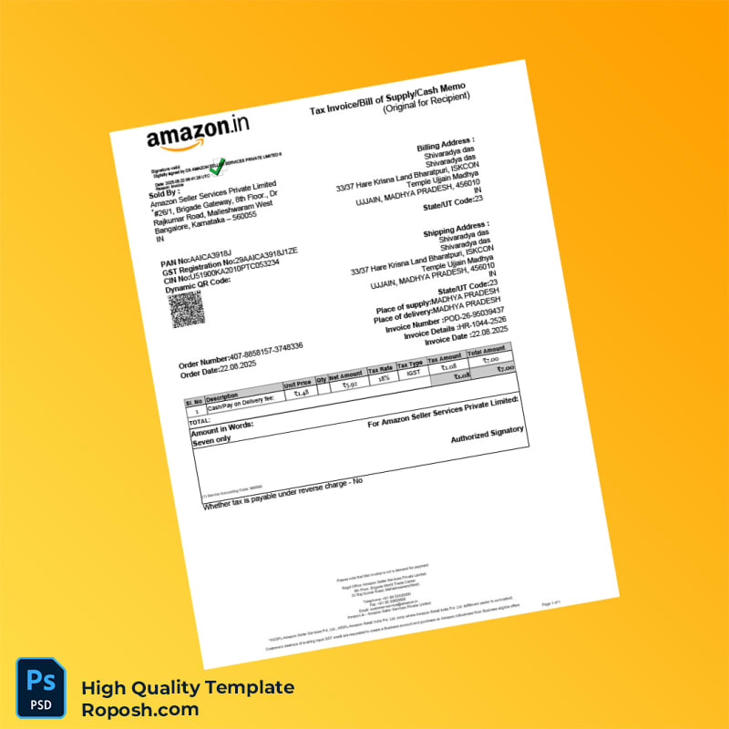 Streamline your billing with the India Amazon Seller Services Private Limited Invoice Template in Word and PDF formats. Perfect for managing India Pantry Pride Tax invoices!