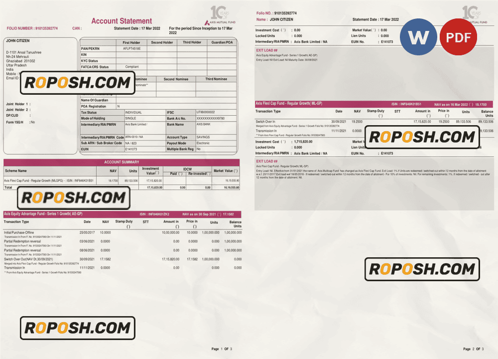 Get your fully editable India Axis Bank Statement template from Roposh today. Perfect for creating novelty documents if your bank statement is expired, stolen, or unavailable. We also offer editable credit card templates, ID card templates, bank statement PSD templates, driver’s license PSD templates, and printable editable blank utility bill templates.