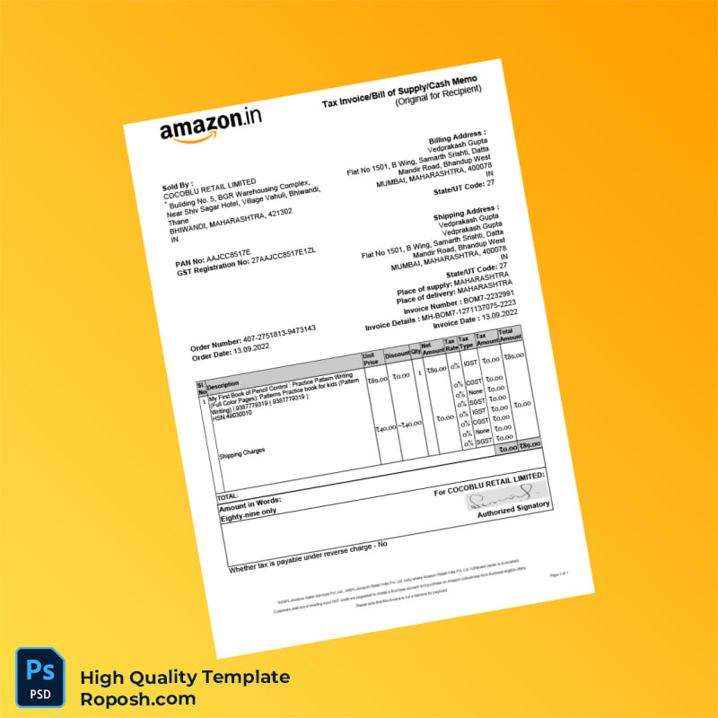 India Cocoblu Retail Tax Invoice Template in Word and PDF Formats