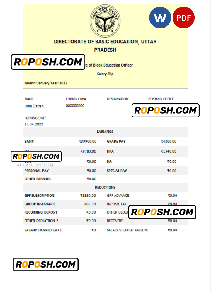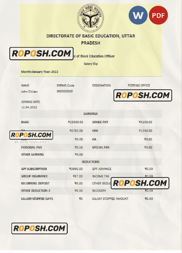 Grab now fully editable India Directorate of Basic Education Uttar Pradesh educational company pay stub Template from our website roposh and put your own info to create a copy of India Directorate of Basic Education Uttar Pradesh educational company pay stub   template Word and ready your own novelty documents. It’ll be so beneficial if your pay stub is expired, stolen or not available. We also have word invoice template, ID Card psd template, Bank Statement psd template, drivers license psd template, Utility bill psd template & pay stub.