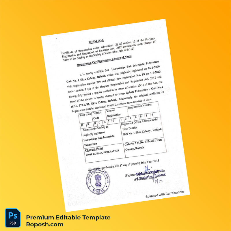 India District Registrar of Societies Registration Certificate Editable Word & PDF Template