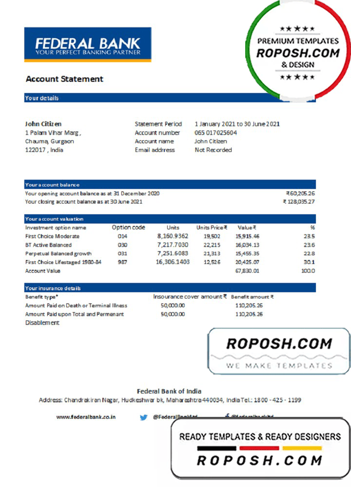 Download the fully editable India Federal Bank Statement Template from Roposh and create your own novelty documents. This template is especially useful if your bank statement is expired, stolen, or unavailable. We also offer a range of other templates, including editable credit cards, ID cards, bank statements, driver’s licenses, and printable editable blank utility bills.