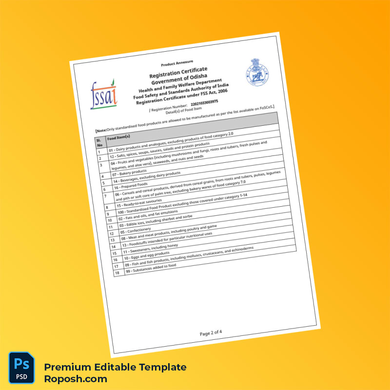 India Food Safety and Standards Authority of India Registration Certificate Editable Word & PDF Template 4 page