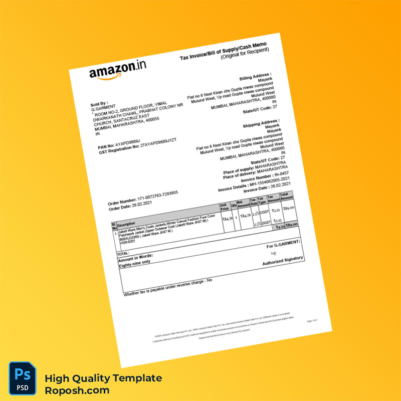 India G GARMENT Tax Invoice Template in Word and PDF Formats