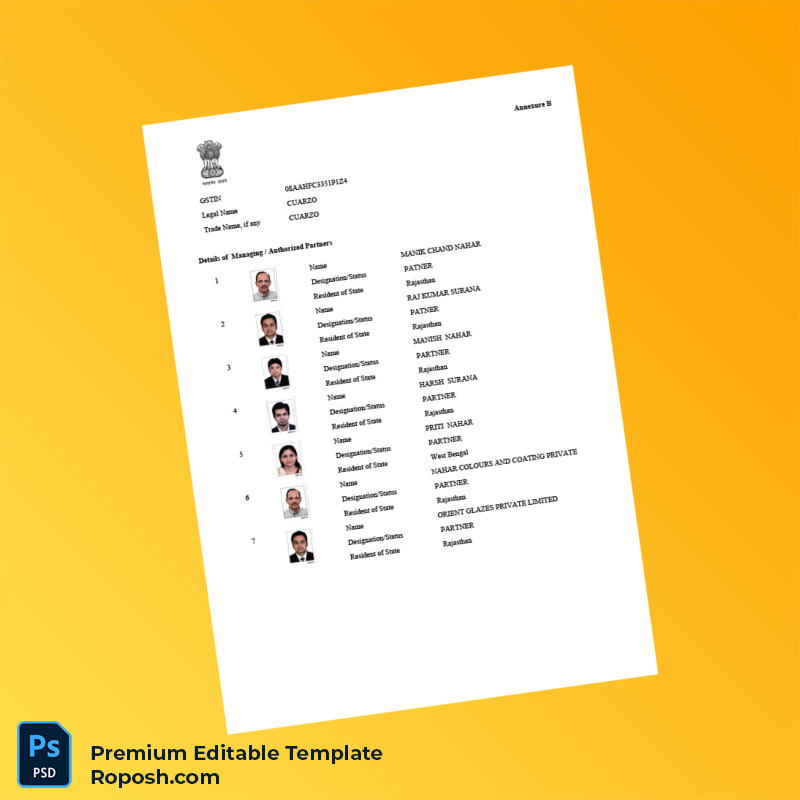 Discover the convenience of the India Government of India Editable GST Registration Certificate Editable Word & PDF Template, expertly designed for professionals who need a quick and accurate way to update and manage their business registration documents. This comprehensive template caters to business owners, accountants, and administrative professionals seeking an efficient solution for maintaining compliance and ensuring accurate record-keeping.