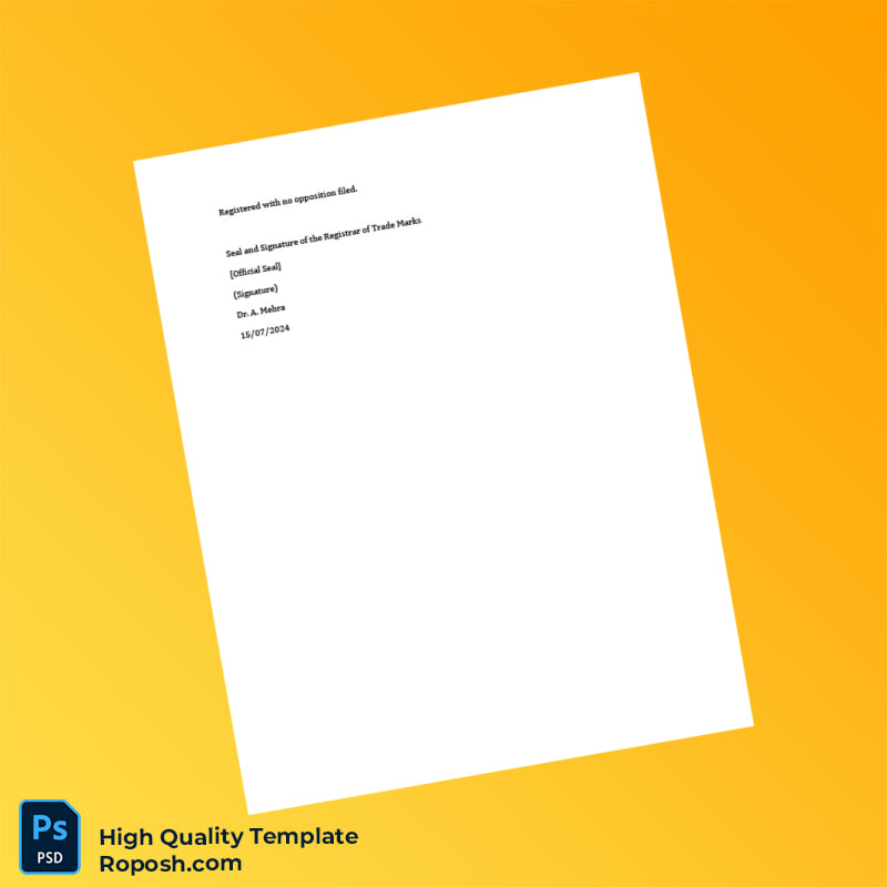 India Government of India Trademark Registration Certificate Template in Word and PDF formats 2 page