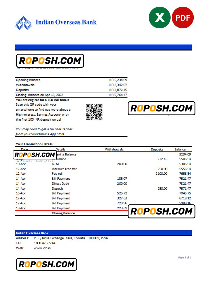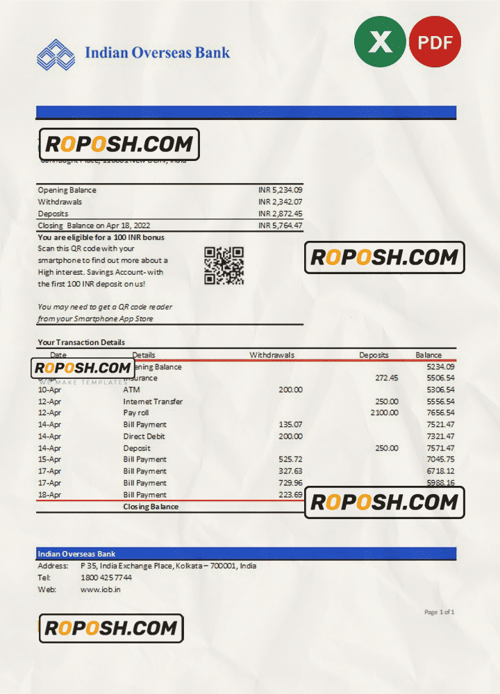 India Indian Overseas Bank statement Template in Excel an PDF format use for :