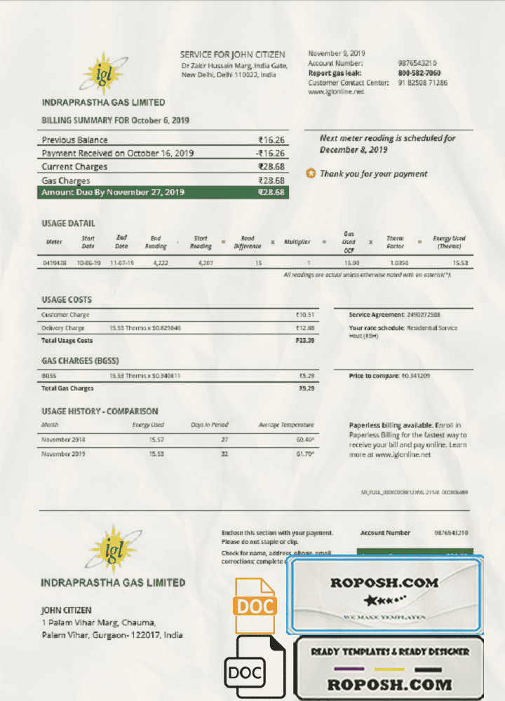 India Indraprastha Gas utility bill Word and Pdf Template use for :