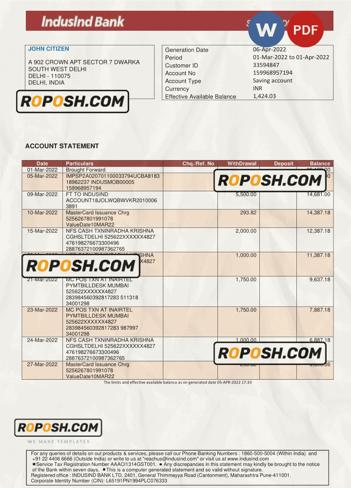 Grab now fully editable India IndusInd bank statement Word Template from our website Roposh and put your own info to create Realistic Bank Statement Word template and ready your own novelty documents. It’ll be so beneficial if your Bank Statement is expired, stolen or not available.We also have editable credit card, ID Card psd template, Bank Statement psd template, drivers license psd template & printable editable blank utility bill template.