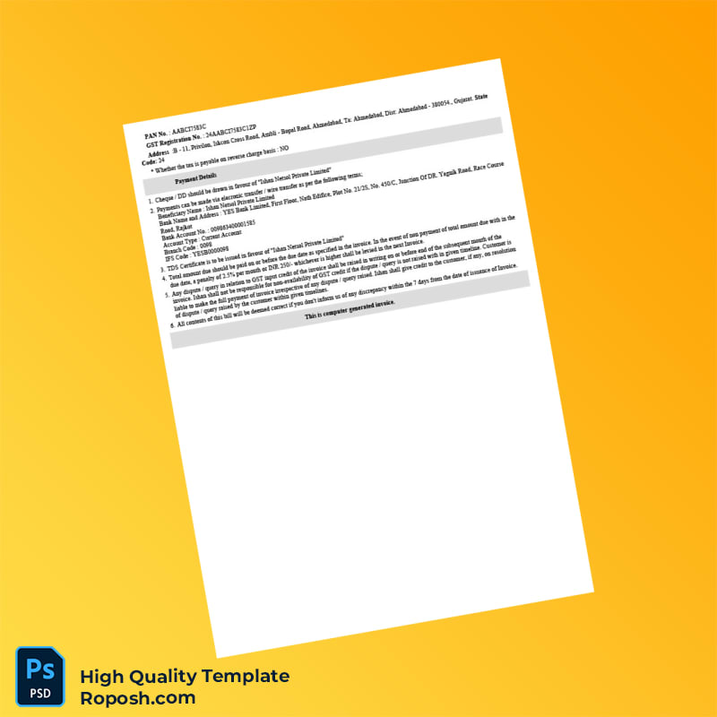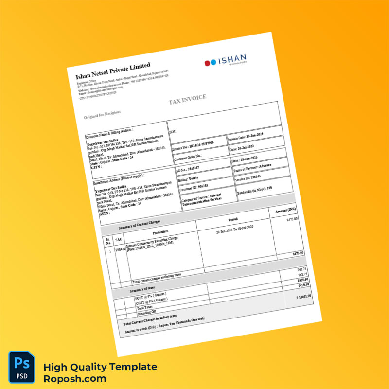 The India Ishan Netsol Private Limited Tax Invoice Template offers a professional, fully editable solution in both Word and PDF formats. Designed for businesses requiring flawless, compliant tax invoices, this template streamlines billing processes with ease and precision. Whether you need a quick replacement or a polished invoice for client records, this editable invoice template ensures accuracy and convenience at your fingertips.