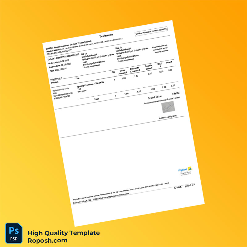 India Jeeves Consumer Services Private Limited Tax Invoice Template in Word and PDF Formats