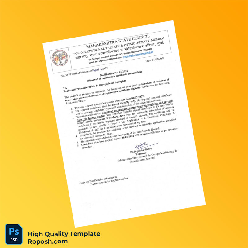 India Maharashtra State Council for Occupational Therapy and Physiotherapy Registration Certificate Template