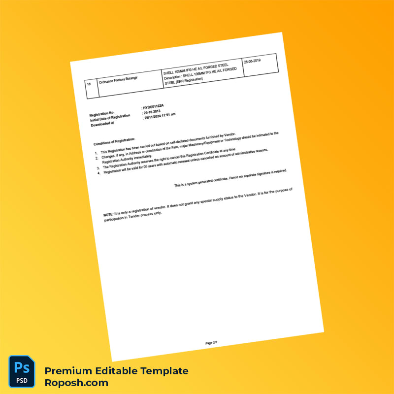 India Ministry of Defence Editable Central Vendor Registration Certificate Editable Word & PDF Template 2 page