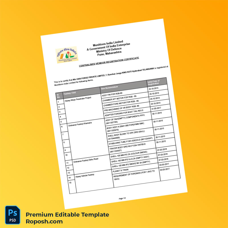 Get the India Ministry of Defence Editable Central Vendor Registration Certificate Editable Word & PDF Template for fast, professional vendor registration updates.