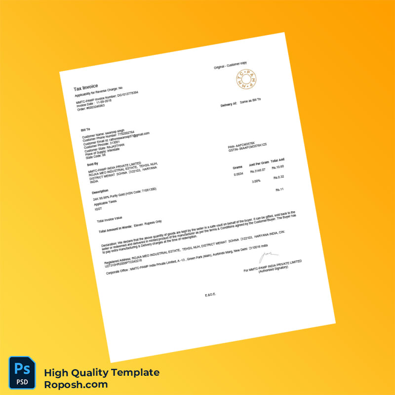 India MMTC-PAMP India Private Limited Tax Invoice Template in Word and PDF Formats