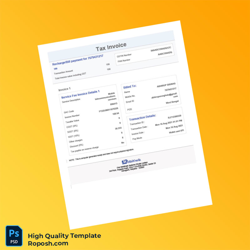 India MobiKwik Tax Invoice Template in Word and PDF formats