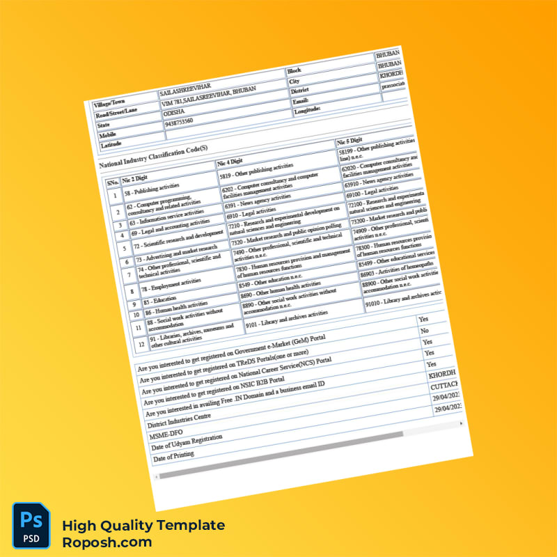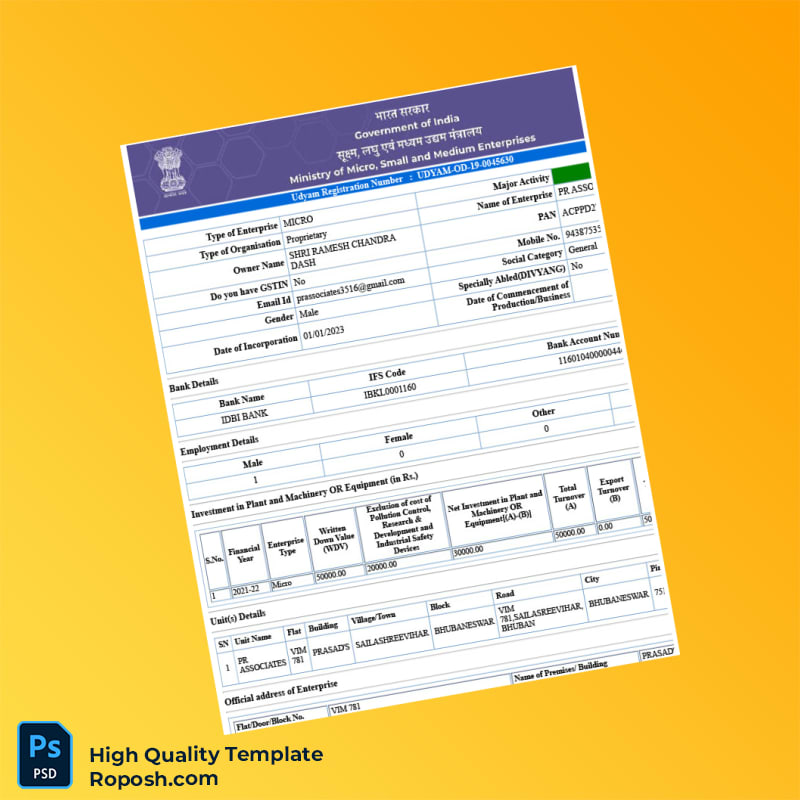 - Includes all required fonts and formatting to maintain the authentic appearance of the original Udyam MSME certificate.