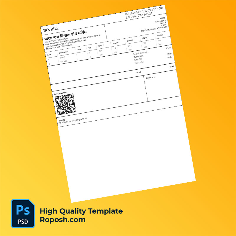 India Paras Nath Kirana Home Service Editable Tax Bill Template in Word and PDF formats