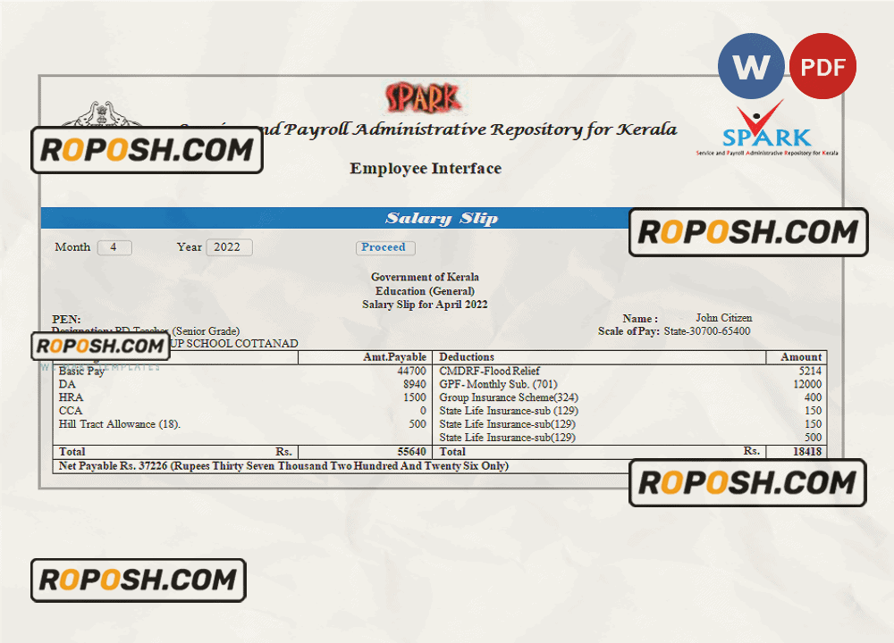 India Service and Payroll Administrative Repository for Kerala payroll company pay stub Word and PDF template