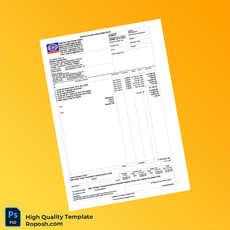 India Shakti Sai Tyres Private Limited Tax Invoice Template in Word and PDF Formats