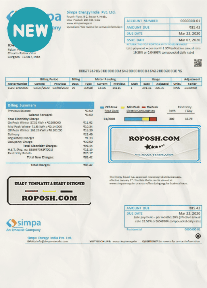 Get your blank India Simpa Energy India Pvt. Ltd utility bill template from Roposh today. Customize it with your own information to create a realistic editable utility bill for proof of address. Ideal for situations where your utility bill is expired, stolen, or unavailable. We also offer a variety of other templates, including passport PSD templates, ID card PSD templates, bank statement PSD templates, driver’s license PSD templates, and utility bill PSD templates.