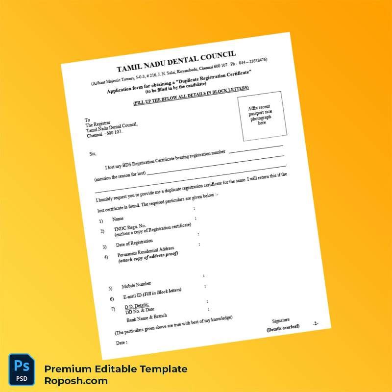 India Tamil Nadu Dental Council Duplicate Registration Certificate Editable Word & PDF Template