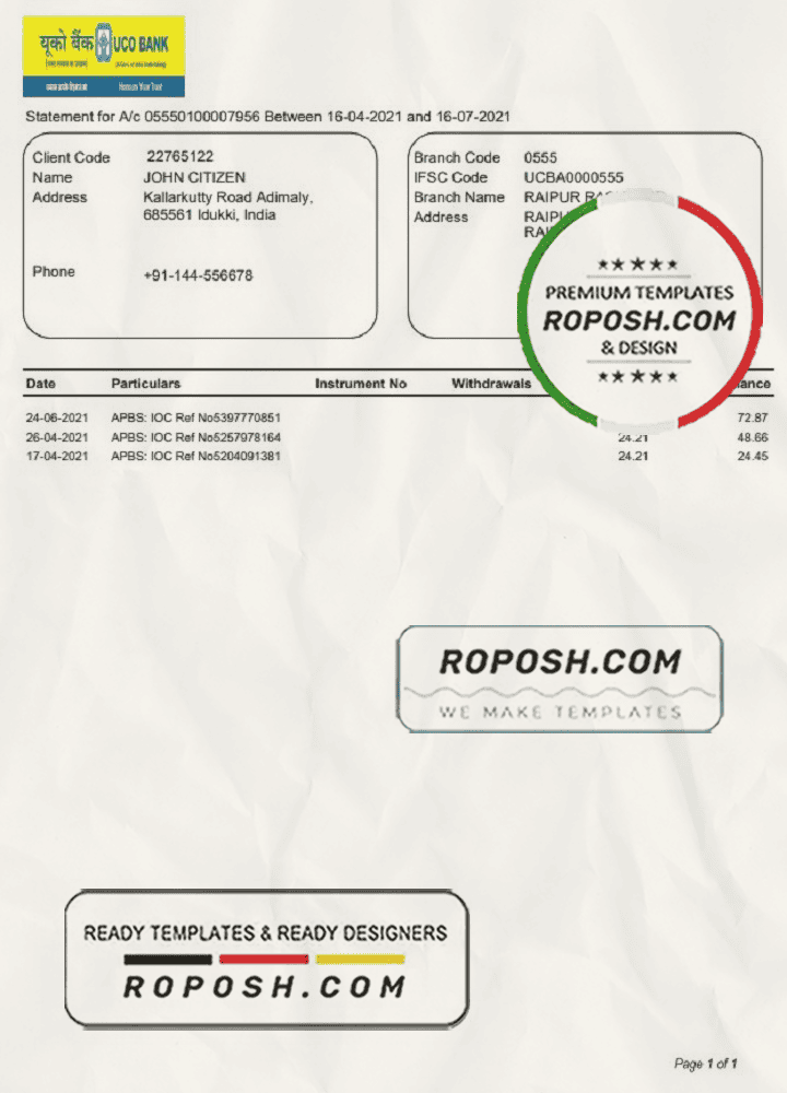 Grab now fully editable India UCO bank statement Word Template from our website Roposh and put your own info to create Realistic Bank Statement Word template and ready your own novelty documents. It’ll be so beneficial if your Bank Statement is expired, stolen or not available.We also have editable credit card, ID Card psd template, Bank Statement psd template, drivers license psd template & printable editable blank utility bill template.