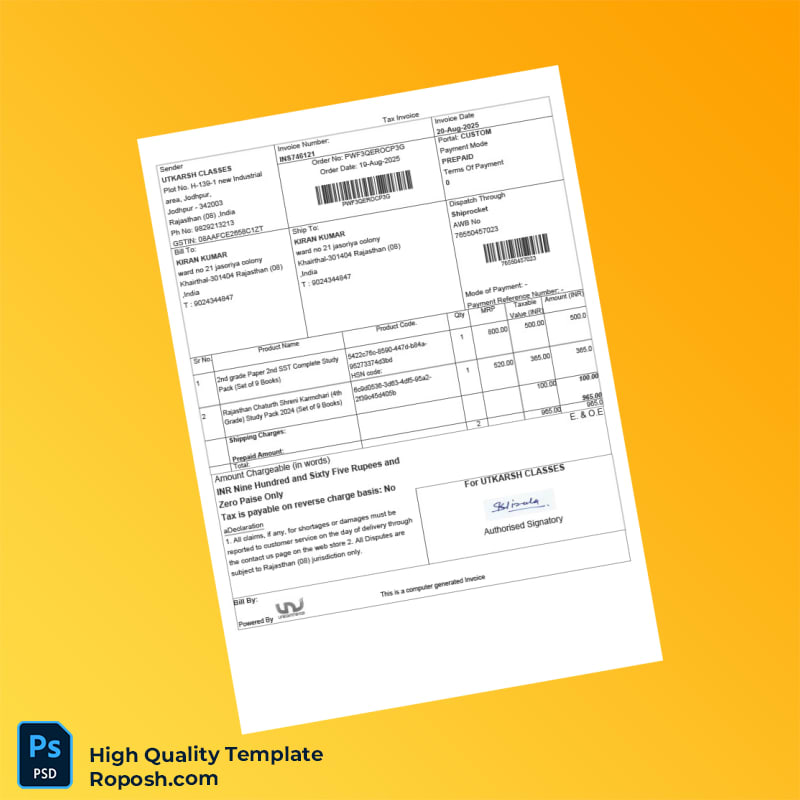 India Utkarsh Classes Invoice Template: Streamlined Billing in Word and PDF