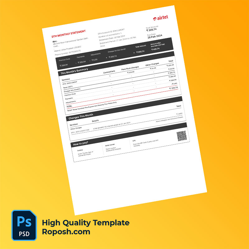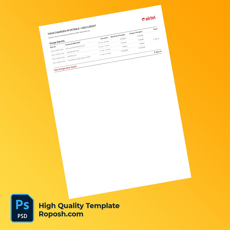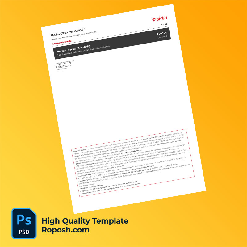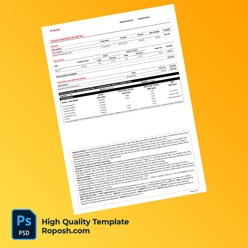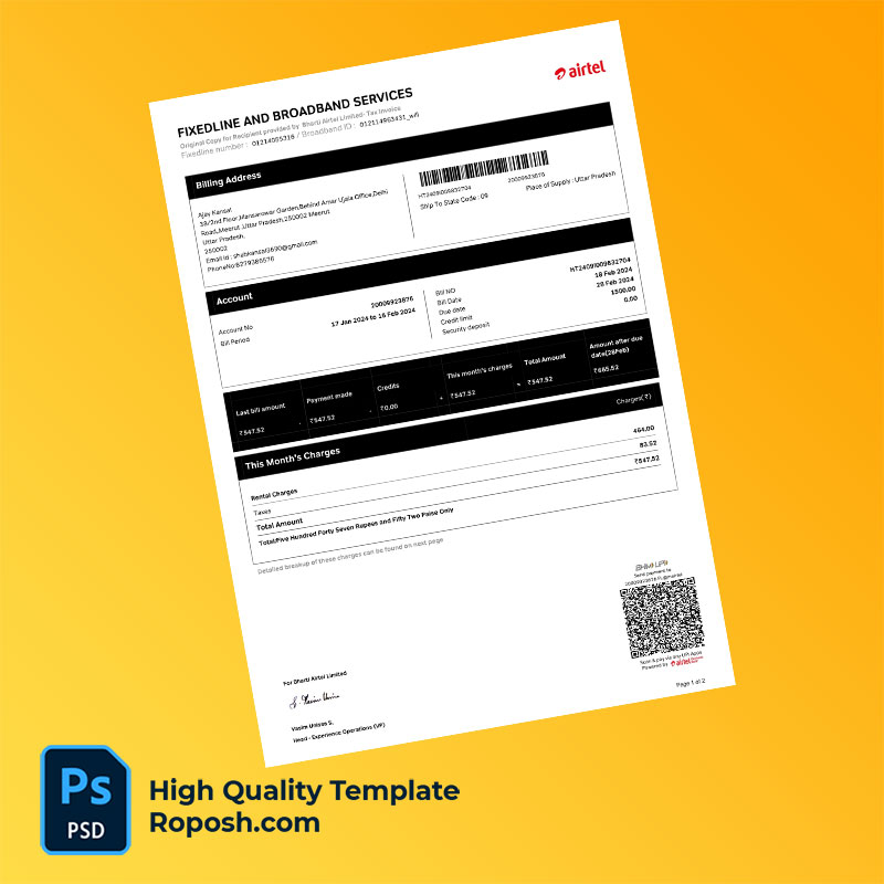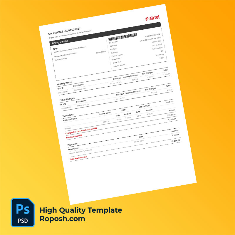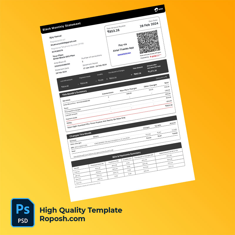 India Uttar Pradesh Bharti Airtel Limited Editable Airtel Black 699 Plan Bill Template in Word and PDF formats