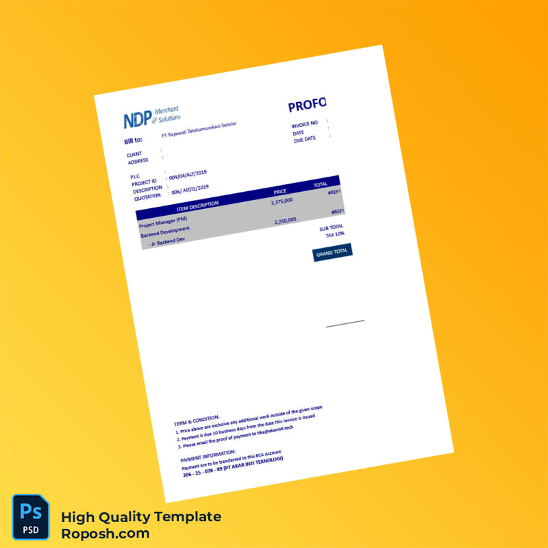 The Indonesia PT Akar Inti Teknologi Invoice Template is a fully editable invoice document available in Word and PDF formats, crafted to meet the needs of businesses requiring a simple yet professional billing solution. Tailored especially for freelancers, small to medium enterprises, and accounting professionals, this template offers full customization and quick deployment to streamline invoicing processes with ease.