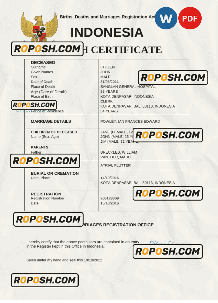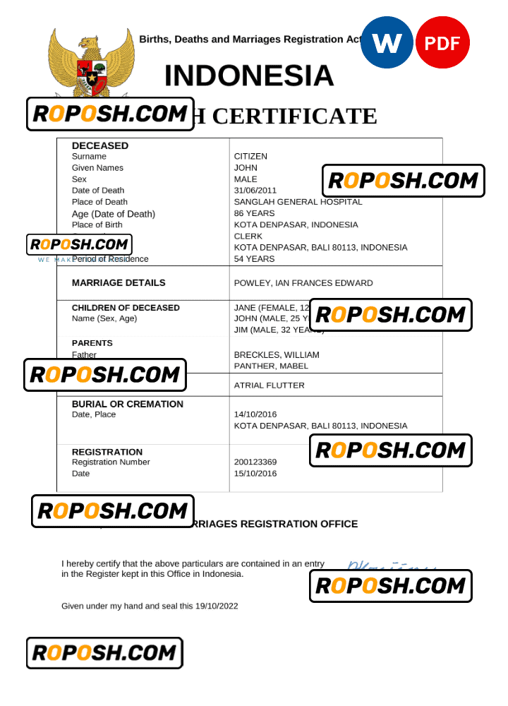 Explore a vast collection of legitimate-looking editable death certificates for several countries worldwide. The editable Indonesia death certificates offers easy access to obtaining the required document for a variety of purposes, predominantly claiming life insurance, pensions, and resolving estates.