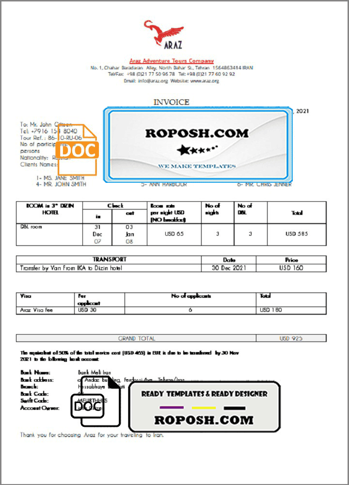 Fillable Iran Araz Tours Company invoice Template :