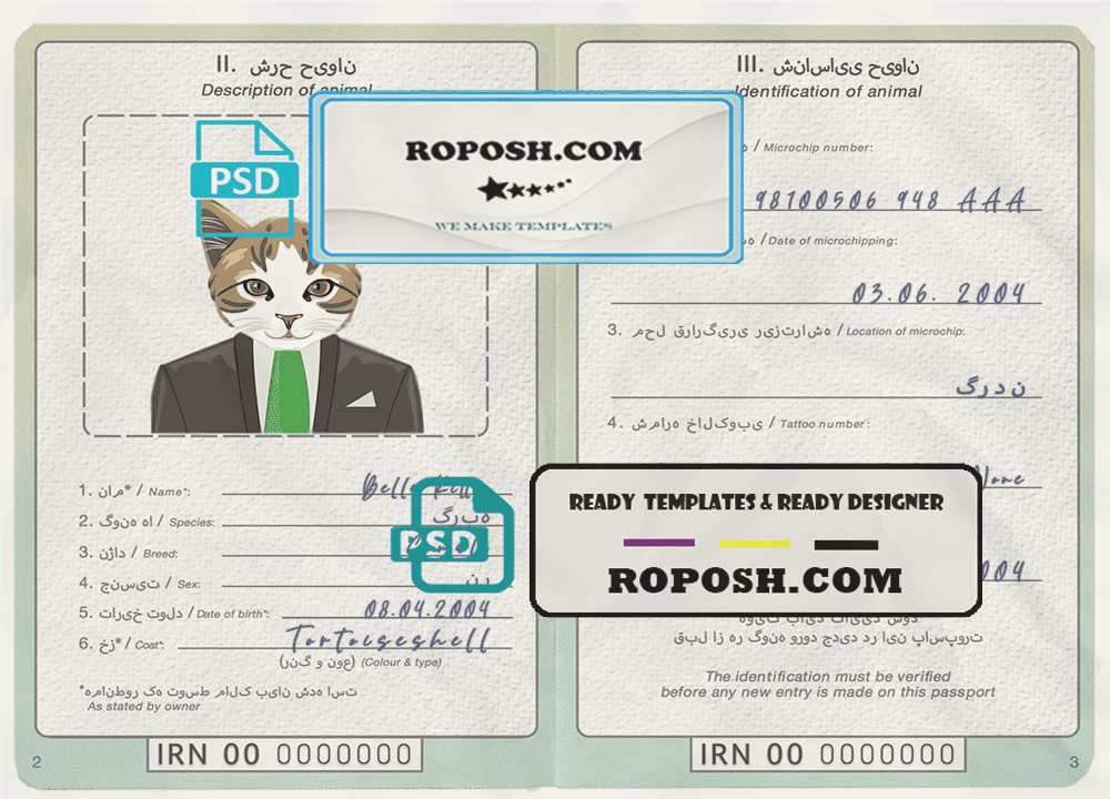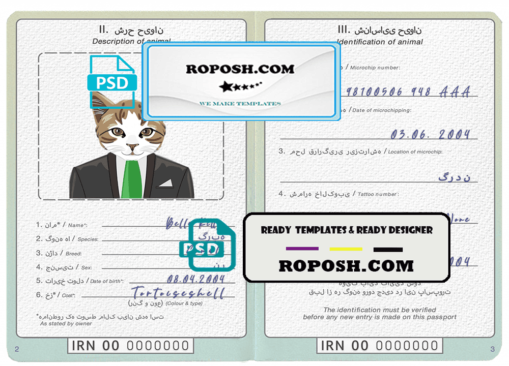 Iran cat (animal, pet) passport PSD template, is designed to look and feel like real documents. Each template is carefully crafted to include all the necessary details, such as your pet’s name, breed, date of birth, and microchip information. With our fillable cat or dog passport templates, you can quickly and easily create a editable pet passport that meets all the requirements for international travel.