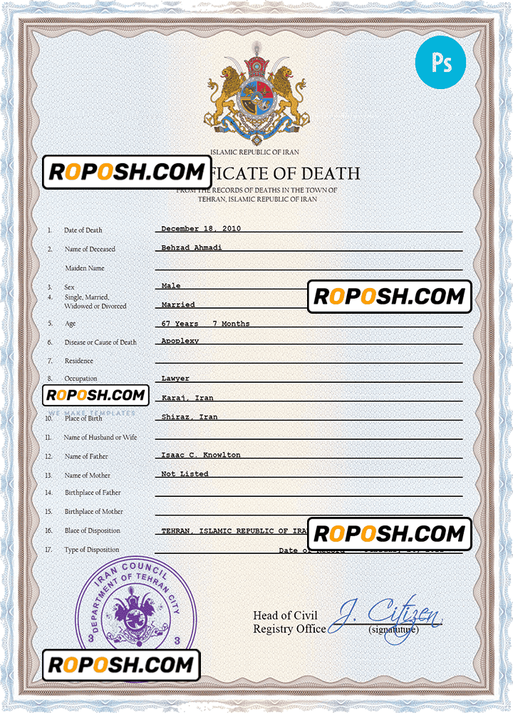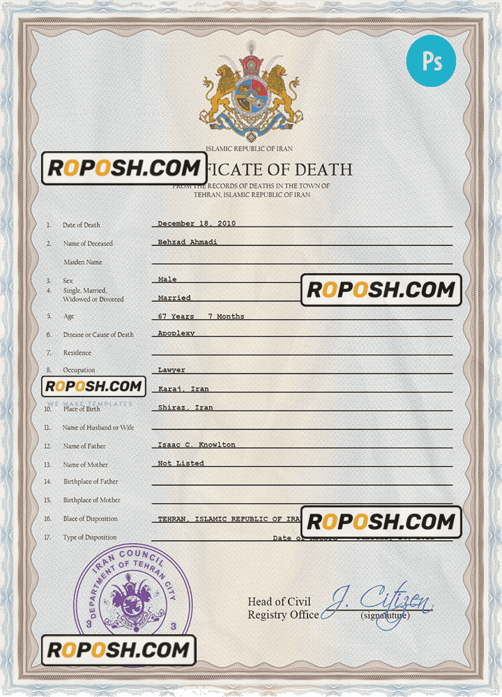 Explore a vast collection of legitimate-looking editable death certificates for several countries worldwide. The editable Iran death certificates offers easy access to obtaining the required document for a variety of purposes, predominantly claiming life insurance, pensions, and resolving estates.
