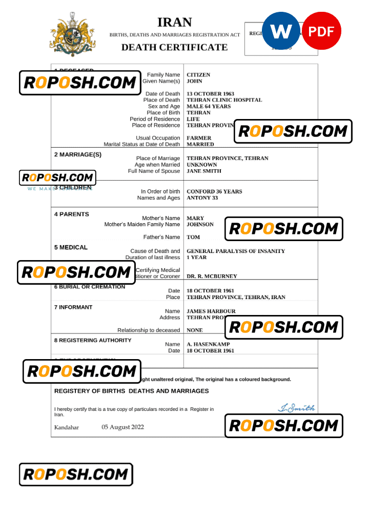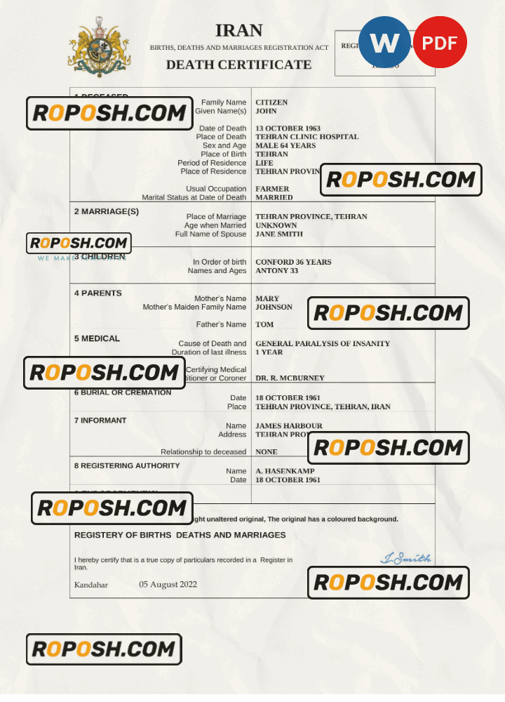 Explore a vast collection of legitimate-looking editable death certificates for several countries worldwide. The editable Iran death certificates offers easy access to obtaining the required document for a variety of purposes, predominantly claiming life insurance, pensions, and resolving estates.