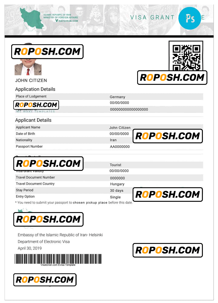 IRAN electronic visa template psd. Buy Customizable Travel Visa Template with high quality and enjoy its unique features such as easy to customize, Layer based, fonts included sample. you can edit this template and  put any name, address, license number, Id number, birth date, height, weight, expire date, change photos etc. This Photoshop template is a layer based psd file and it’s easy to Editing.To modify this photoshop template file you will need a Photo editing software such as Adobe Photoshop No need to be expert on editing software like adobe Photoshop. However, You just have to basic knowledge on adobe photoshop, to edit this template. Never used low quality template. Your account may be suspended. Also, if you’re looking for an editable SSN template, Roposh is by your side so you can get it easily and even for free.