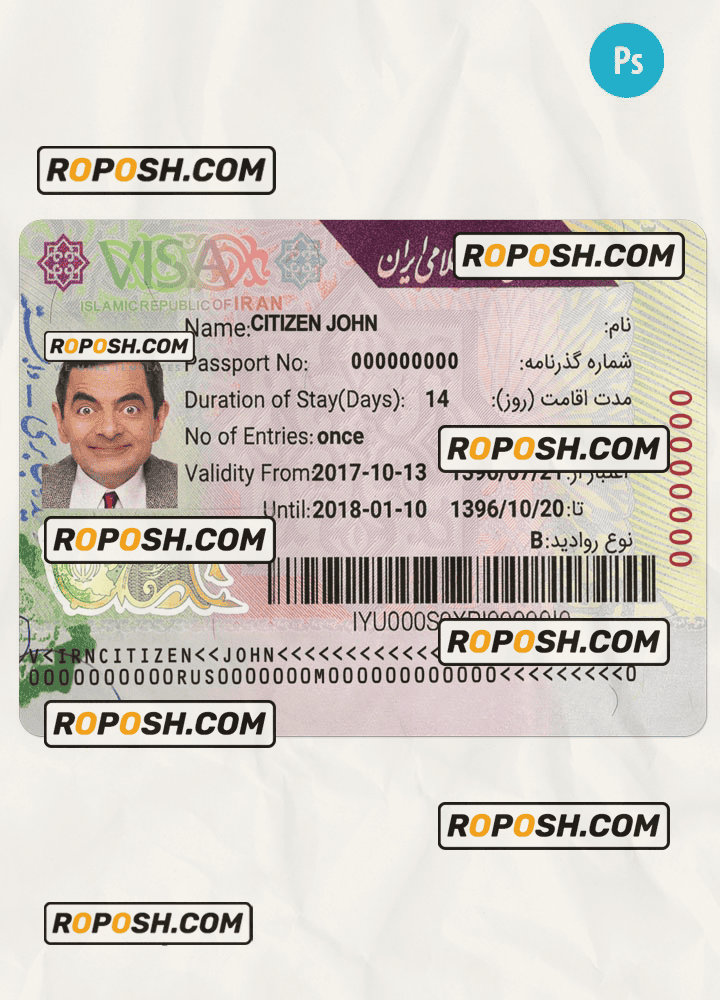 Iran entry visa template psd. Buy Customizable Travel Visa Template with high quality and enjoy its unique features such as easy to customize, Layer based, fonts included sample. you can edit this template and  put any name, address, license number, Id number, birth date, height, weight, expire date, change photos etc. This Photoshop template is a layer based psd file and it’s easy to Editing.To modify this photoshop template file you will need a Photo editing software such as Adobe Photoshop No need to be expert on editing software like adobe Photoshop. However, You just have to basic knowledge on adobe photoshop, to edit this template. Never used low quality template. Your account may be suspended. Also, if you’re looking for an editable SSN template, Roposh is by your side so you can get it easily and even for free.