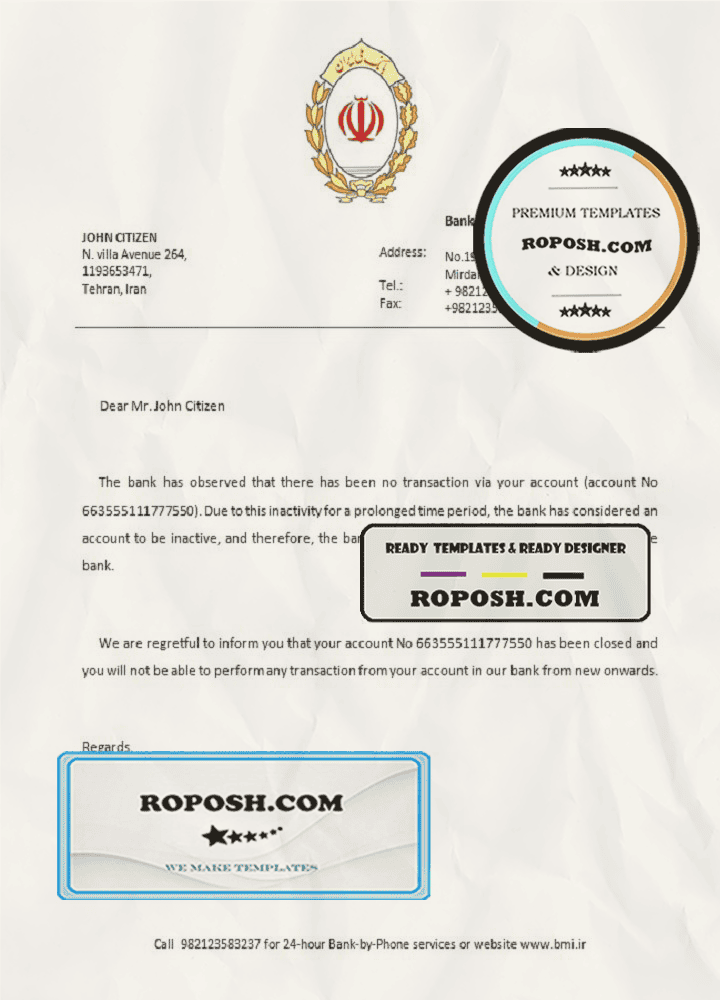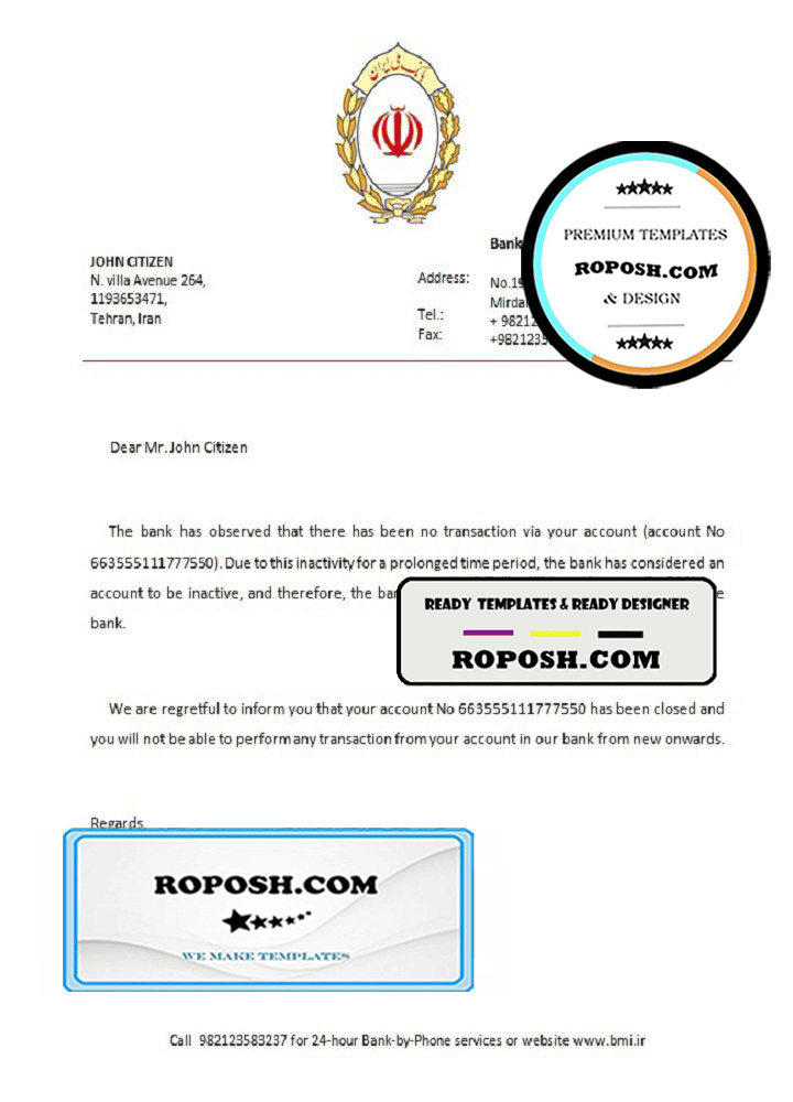Iran Melli bank account closure reference letter template in Word and PDF format