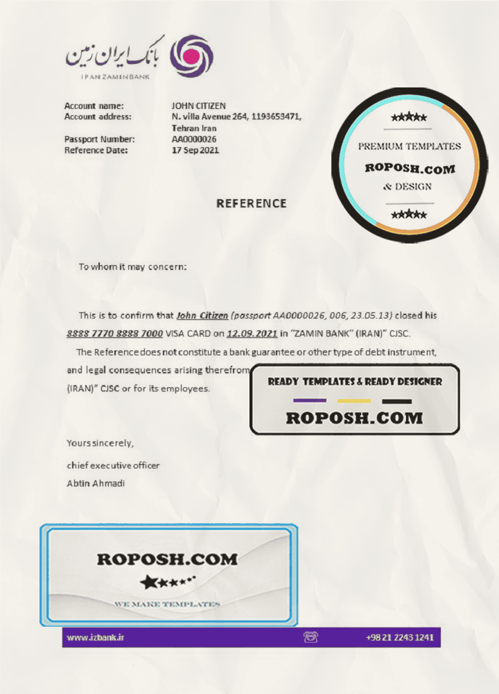 Iran Zamin bank account closure reference letter template in Word and PDF format