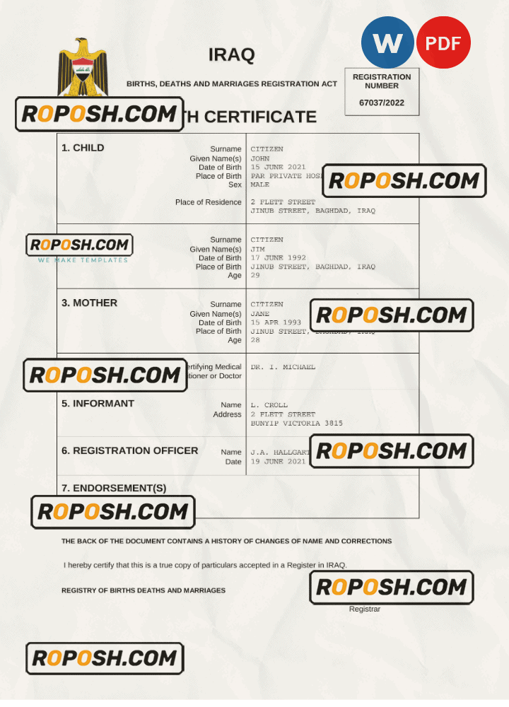 roposh offers hundreds of high-quality, realistic, and customizable birth certificates. The Iraq birth certificate template is fully fillable, and you can complete it with any information you wish, such as name, surname, birth date, place of birth and etc. Whether you are using our PSD template (a layer-based adobe photoshop file) or our PDF template (a Microsoft Office editable file) you will get a package with fonts included instantly. No need to worry even if you can’t generate realistic birth proof yourself, we offer reliable editing service with your desired information for an extra charge. Also, we are always online and here to help you experience a confident purchase. So, reach out!