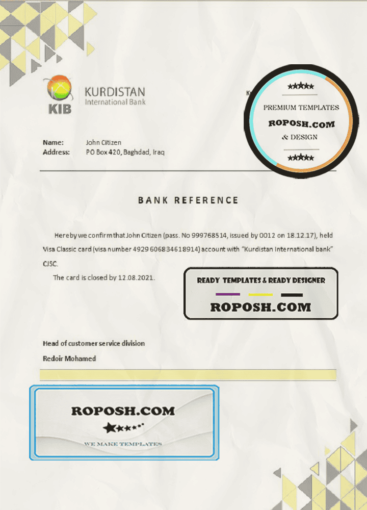 Iraq Kurdistan International bank account closure reference letter template in Word and PDF format