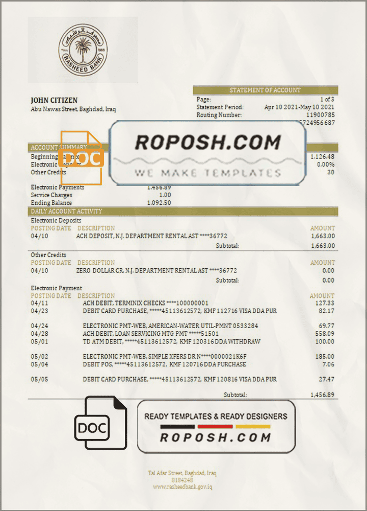 Grab now fully editable Iraq Rasheed proof of address bank statement in Word Template from our website Roposh and put your own info to create Realistic Bank Statement Word template and ready your own novelty documents. It’ll be so beneficial if your Bank Statement is expired, stolen or not available.We also have editable credit card, ID Card psd template, Bank Statement psd template, drivers license psd template & printable editable blank utility bill template.