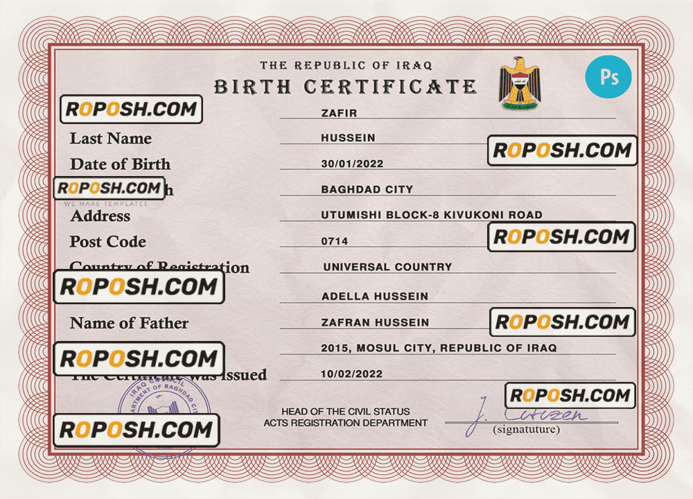roposh offers hundreds of high-quality, realistic, and customizable birth certificates. The Iraq birth certificate template is fully fillable, and you can complete it with any information you wish, such as name, surname, birth date, place of birth and etc. Whether you are using our PSD template (a layer-based adobe photoshop file) or our PDF template (a Microsoft Office editable file) you will get a package with fonts included instantly. No need to worry even if you can’t generate realistic birth proof yourself, we offer reliable editing service with your desired information for an extra charge. Also, we are always online and here to help you experience a confident purchase. So, reach out!
