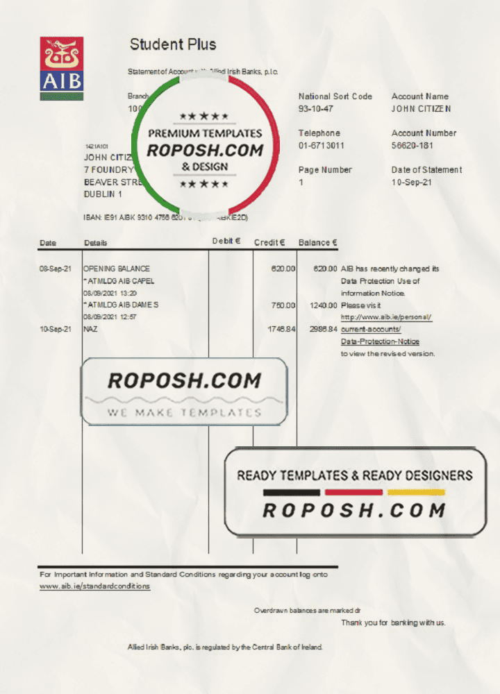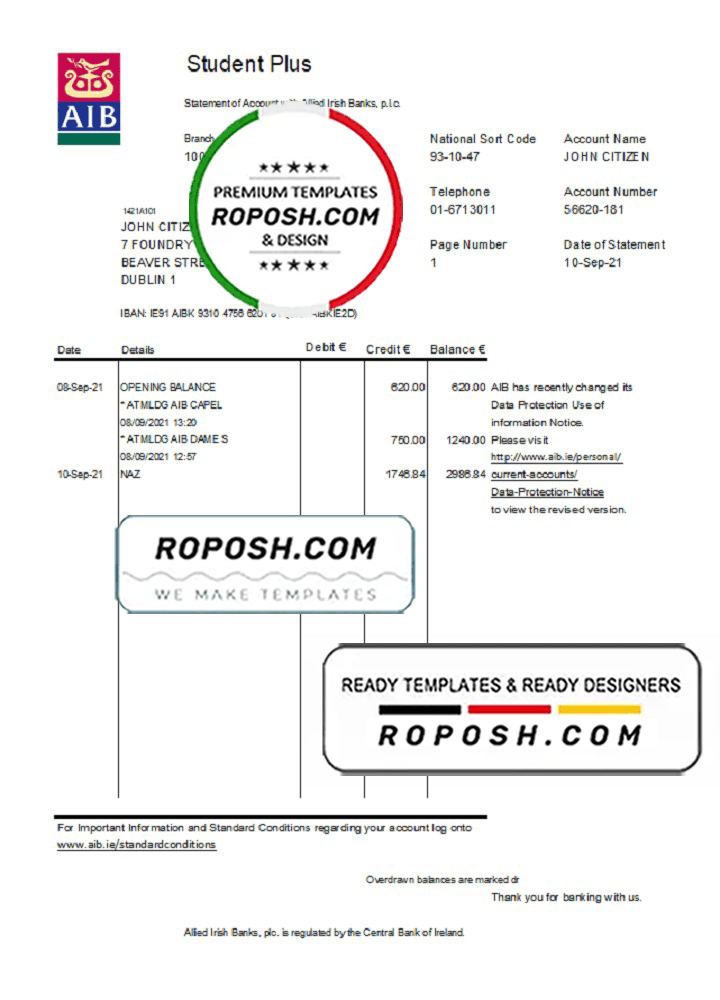 Grab now fully editable Ireland AIB bank statement easy to fill Excel Template from our website Roposh and put your own info to create Realistic Bank Statement template Excel and ready your own novelty documents. It’ll be so beneficial if your Bank Statement is expired, stolen or not available.We also have editable credit card, ID Card psd template, Bank Statement psd template, drivers license psd template & printable editable blank utility bill template.