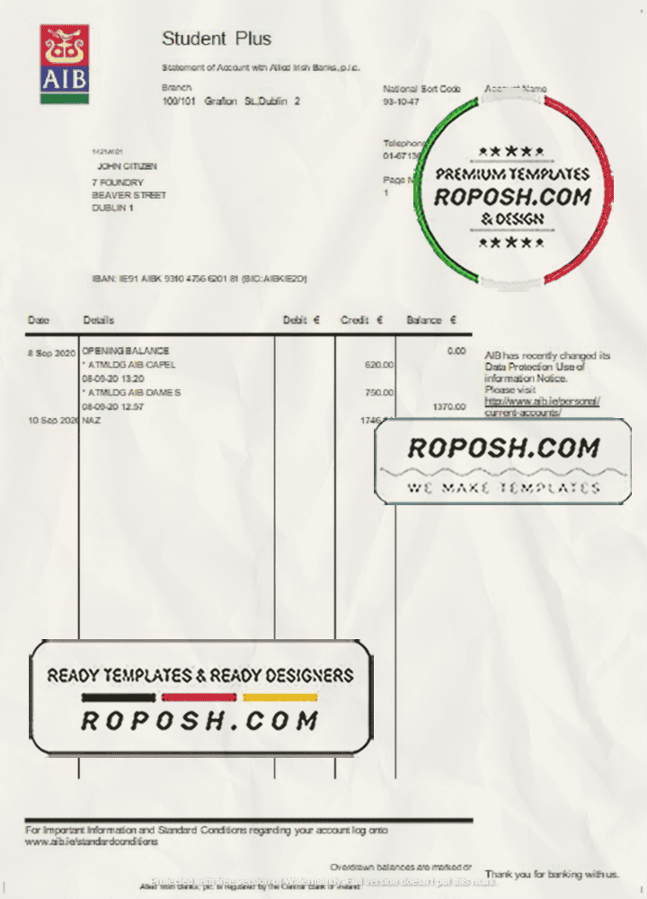 Get your fully editable Ireland AIB Bank Statement Word Template from Roposh today. Customize it with your information to create realistic bank statements, perfect for when your original documents are expired, stolen, or unavailable. We also offer editable credit card templates, ID card templates, bank statement PSD templates, driver’s license PSD templates, and printable editable blank utility bill templates.