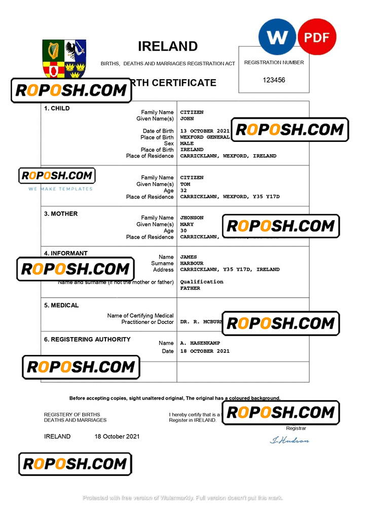 roposh offers hundreds of high-quality, realistic, and customizable birth certificates. The Ireland birth certificate template is fully fillable, and you can complete it with any information you wish, such as name, surname, birth date, place of birth and etc. Whether you are using our PSD template (a layer-based adobe photoshop file) or our PDF template (a Microsoft Office editable file) you will get a package with fonts included instantly. No need to worry even if you can’t generate realistic birth proof yourself, we offer reliable editing service with your desired information for an extra charge. Also, we are always online and here to help you experience a confident purchase. So, reach out!