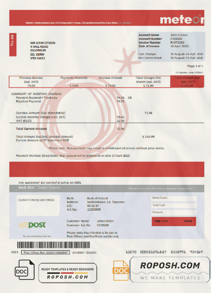 Get your blank Ireland Meteor utility bill template from Roposh today. Customize it with your own information to create a realistic editable utility bill for proof of address. Ideal for situations where your utility bill is expired, stolen, or unavailable. We also offer a variety of other templates, including passport PSD templates, ID card PSD templates, bank statement PSD templates, driver’s license PSD templates, and utility bill PSD templates.